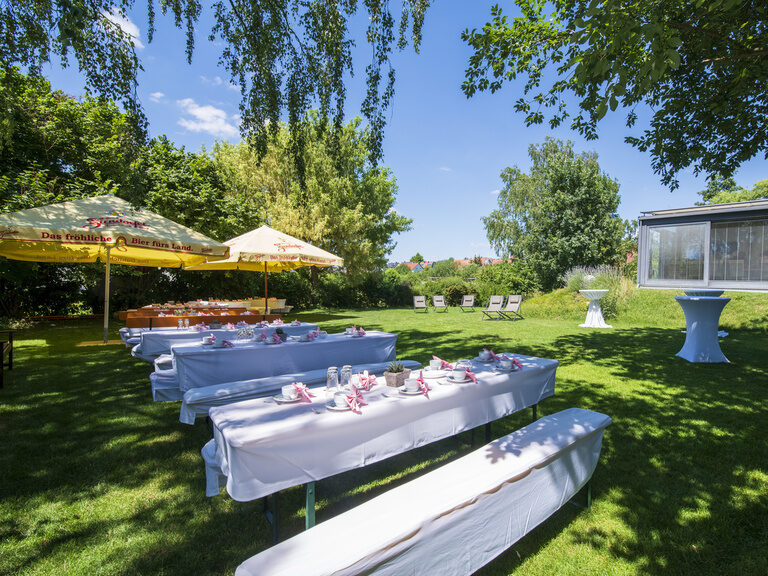 Unser idyllischer Garten ist ideal für Sektempfänge im Freien und bietet eine wunderschöne Kulisse für entspannte Veranstaltungen im Grünen.
