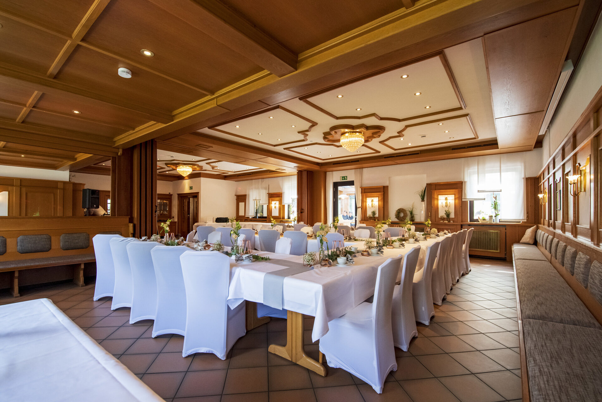 Die gemütliche Gaststube lädt mit ihrem rustikalen Charme und warmem Ambiente zu geselligen Zusammenkünften und familiären Feiern ein.